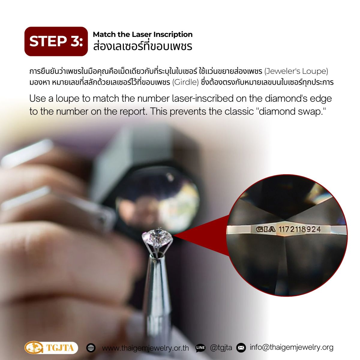 Use a Jeweler’s Loupe to check the laser-inscribed report number engraved on the diamond’s girdle. This number must match the certificate perfectly.