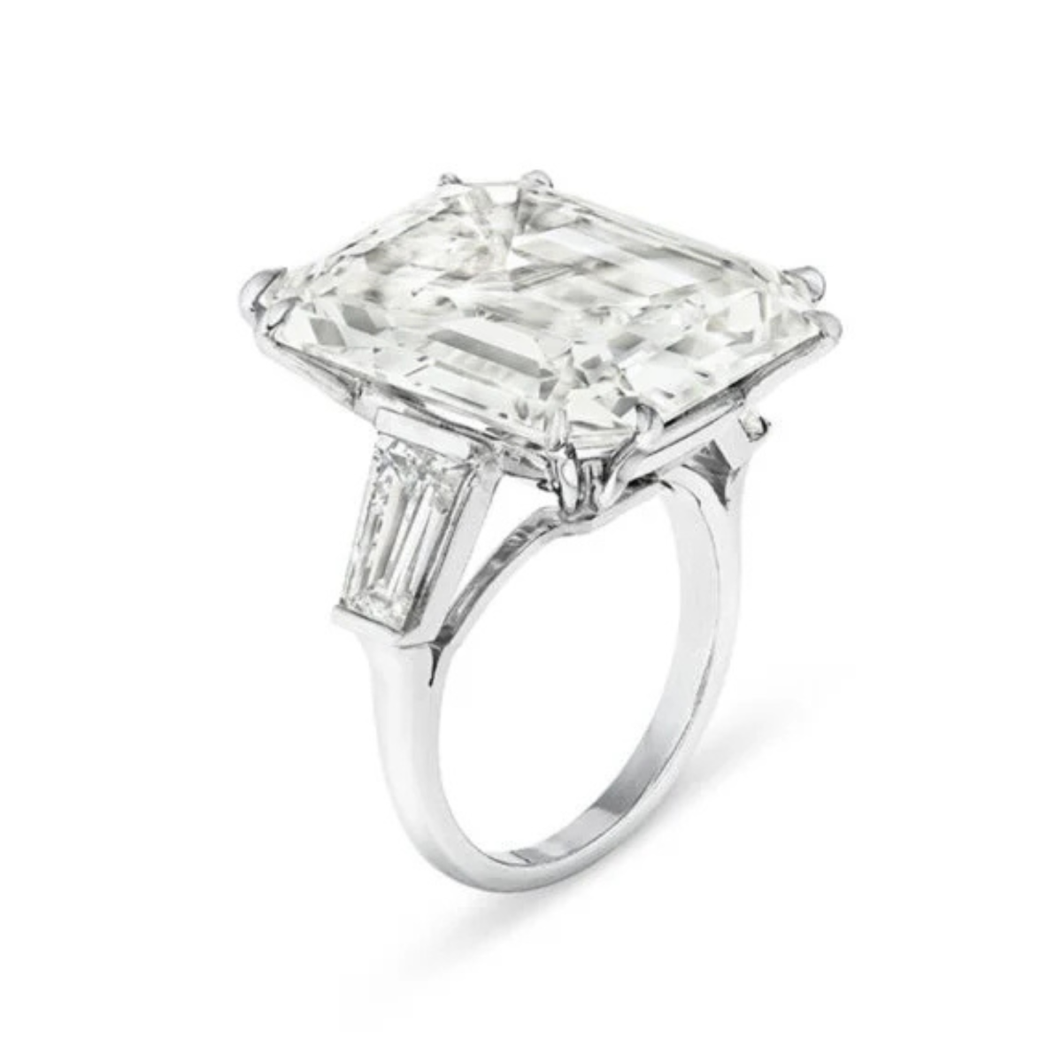 • This ring features an emerald-cut, 24.99-carat, J-color, VS1-clarity diamond with baguette-cut diamond shoulders. It has an upper estimate of $600,000.