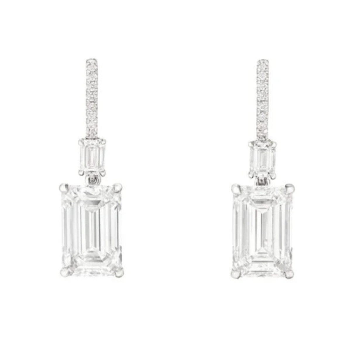 • A pair of earrings comprising emerald-cut diamonds, one a 5.03-carat, D, VS1 and the other a 5.02-carat, E, VVS1 stone, both suspended from emerald-cut and round diamonds, will go on the auction block for as much as $300,000.