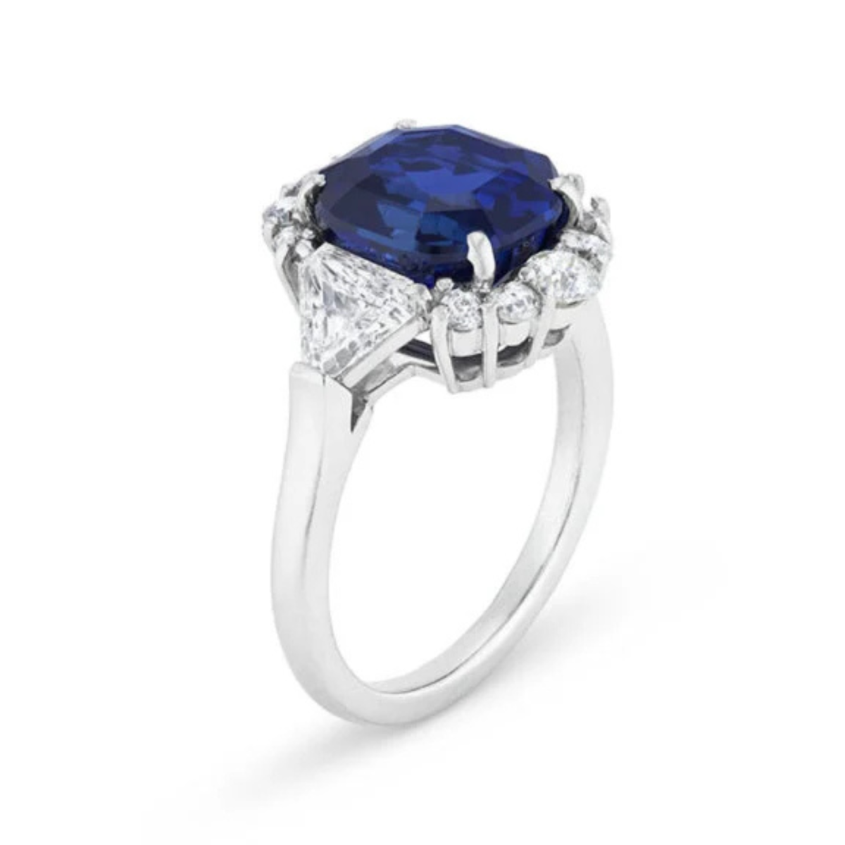 • Christie’s is offering this ring with a modified octagonal step-cut, royal-blue Kashmir sapphire between triangular-diamond shoulders for up to $300,000.