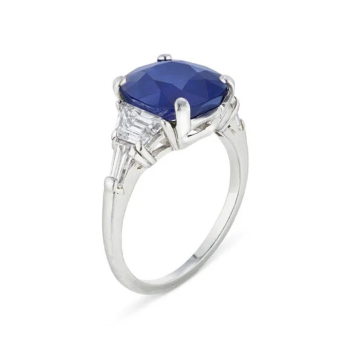 • This cushion mixed-cut sapphire will go under the hammer for up to $250,000. It features a 4.81-carat Kashmir sapphire between trapezoid diamonds.